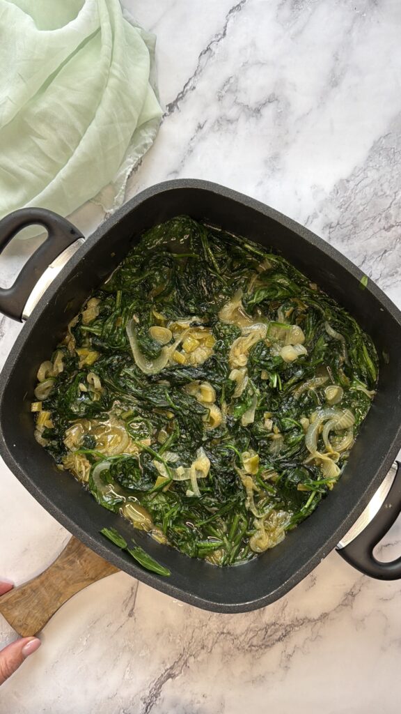 1. Rozehřejte pánev, nalijete olivový olej a restujte 2΄cibuli společně s jarní cibulkou a česnekem, pak přidejte špenát, a nechte další 2’ povadnout. Jakmile máte hotovo, přidejte 50 ml vody a 3-4′ poduste. Potom dejte stranou a tyčovým nebo jiným mixerem směs nahrubo rozmixujte.