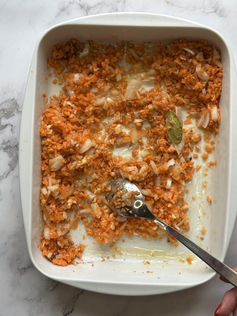 2. Do zapékaci mísy dejte cibuli, mrkev, kořen petržele a olivový olej, okořeňte solí, pepřem, sladkou paprikou a přidejte špetku čili vloček. Promíchejte, vložte do předehřáté trouby a pečte 10-12’.