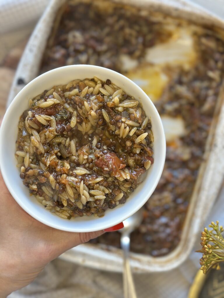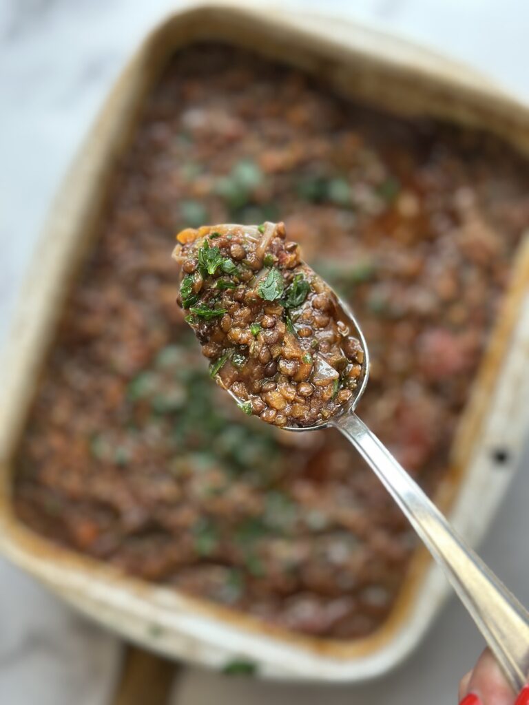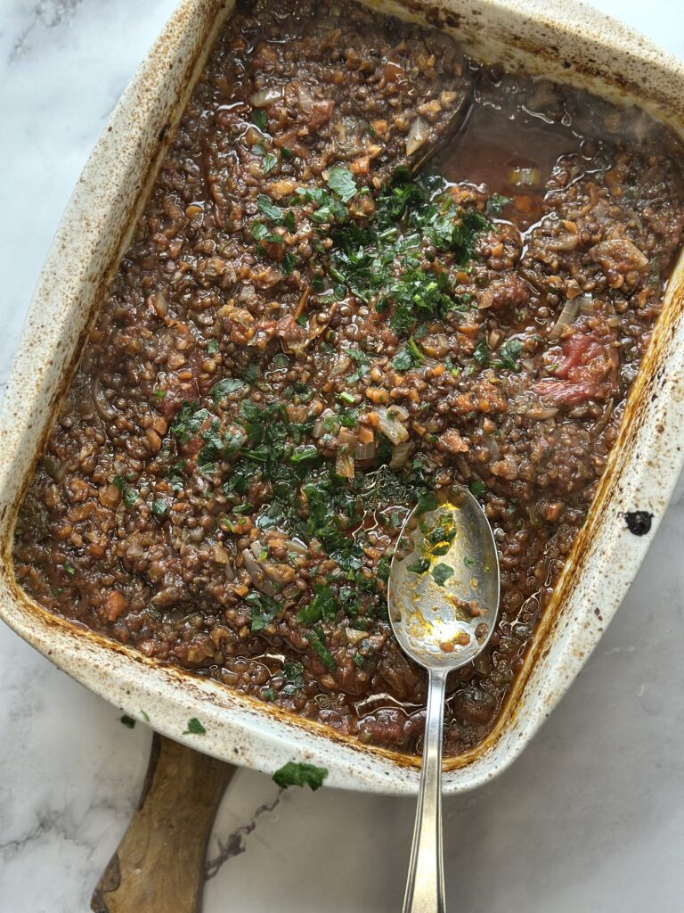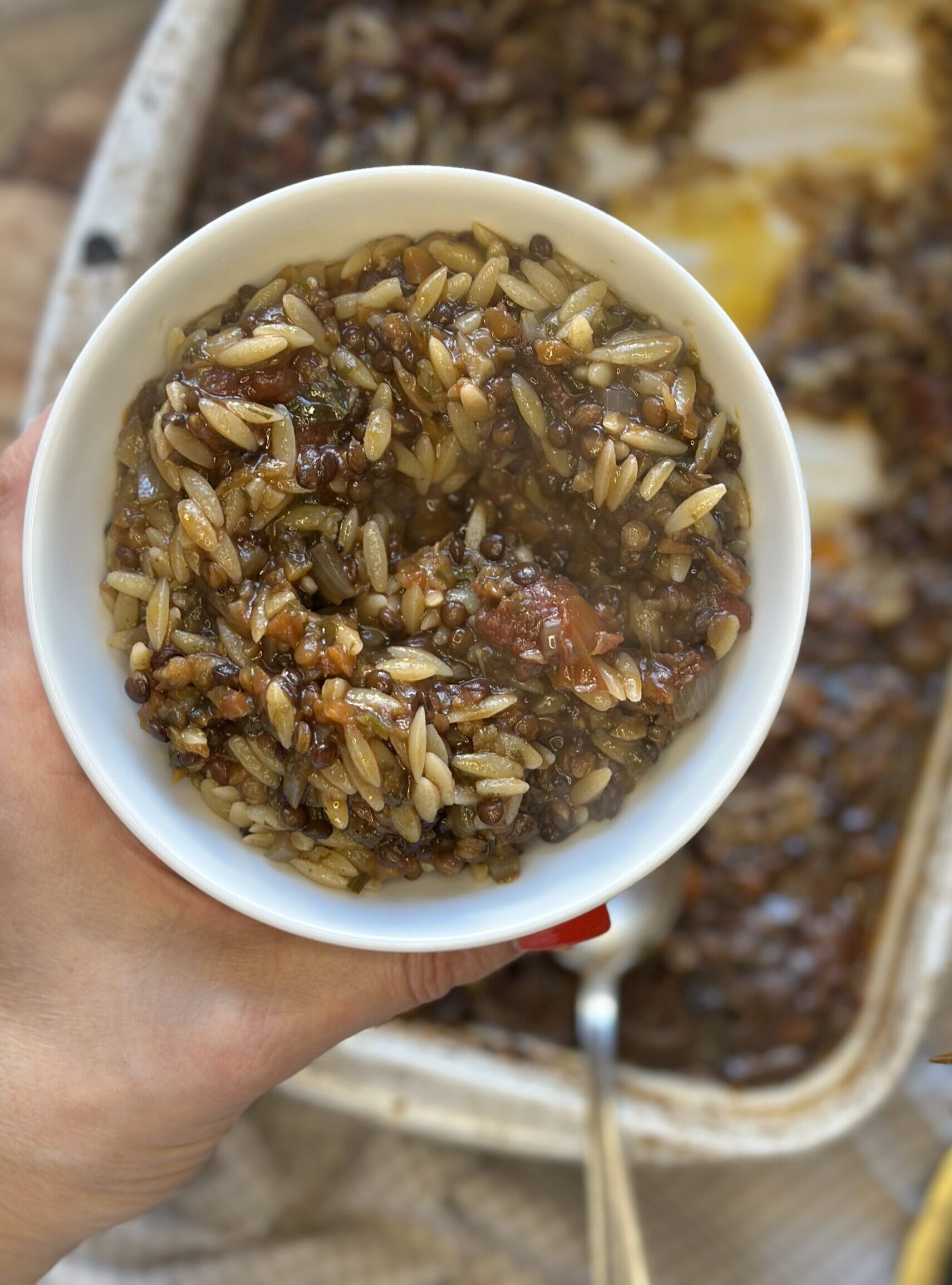 Tohle ragú z čočky Beluga je důkazem, že skvělé jídlo nemusí obsahovat ani gram masa. Čočka svou pevnou strukturou a jemně oříškovou chutí připomíná drobivou masovou omáčku, ale je lehčí, plná rostlinných bílkovin a navíc skvěle nasákne všechny chutě omáčky. V kombinaci s těstovinovou rýží vzniká dokonale vyvážené jídlo, které zasytí a zahřeje, ať už si ho dáš v zimě jako hřejivý comfort food, nebo v létě s čerstvými bylinkami a parmazánem.