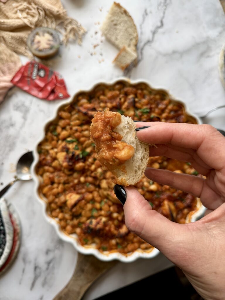 2. Přesuňte směs do zapékací mísy, přidejte uvařené fazole a vodu, promíchejte a pak nadrobno nakrájenou petrželku. Vložte do předehřáté trouby na 200 °C a pečte cca 20 minut, dokud se chutě nespojí a omáčka nezhoustne. Podávejte s pečivem, rýží nebo bramborovou kaší podle chuti.