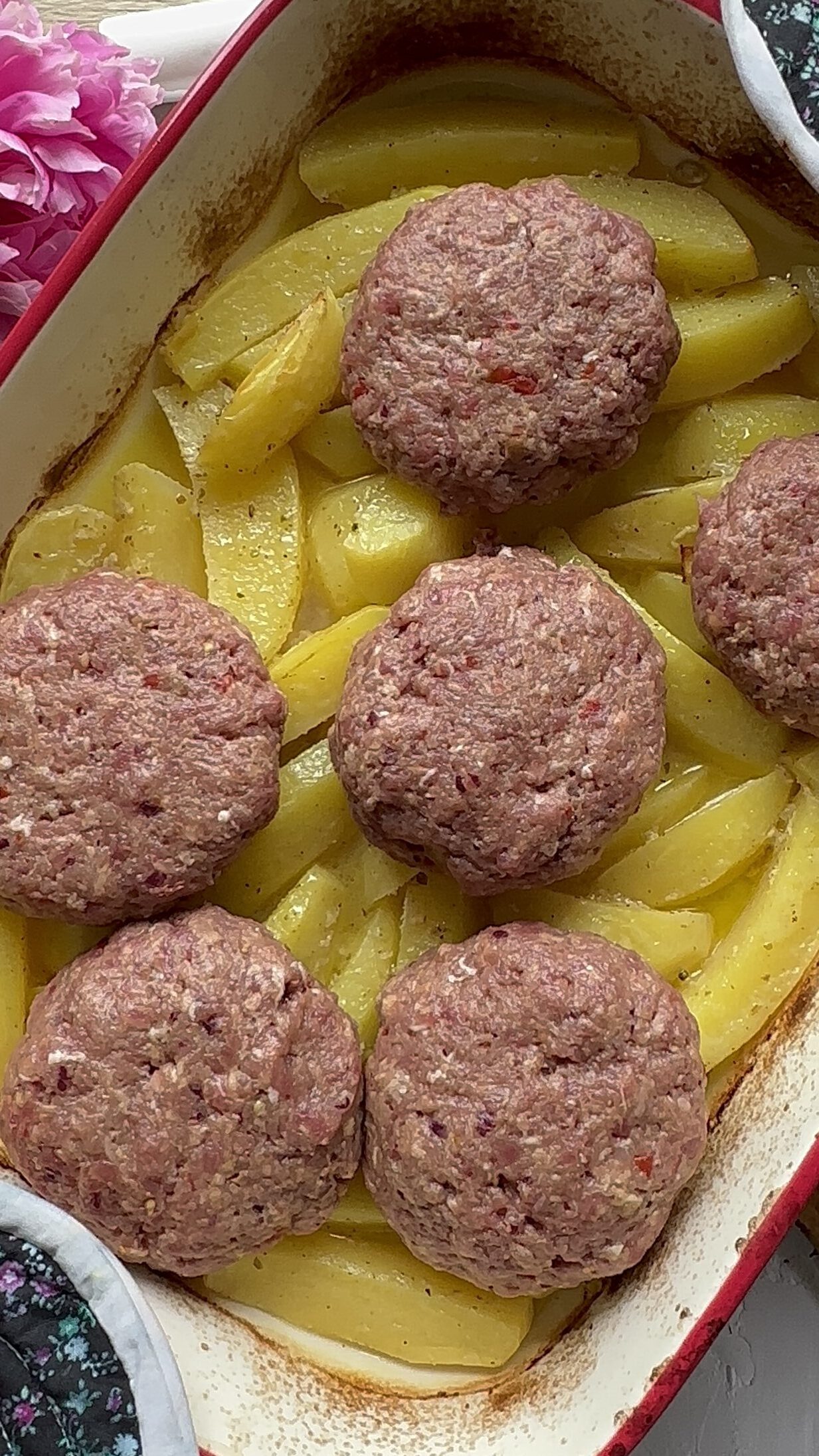 5. Po 45’ vytáhnete z trouby brambory, je-li potřeba podlijete trochou vody. Z mletého masa udělejte 6 karbanátek, položte na brambory a dejte znovu do trouby (již bez zakrytí) na cca 30-35’ zapéct.