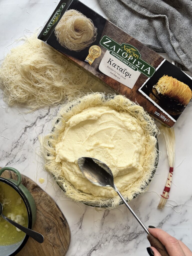 Kataifi se v Řecku často připravuje podobně jako galaktoboureko – princip je stejný: horký dezert, horký sirup, žádné spěchání. Nejlepší je až druhý den, kdy se chutě propojí a struktura ustálí.