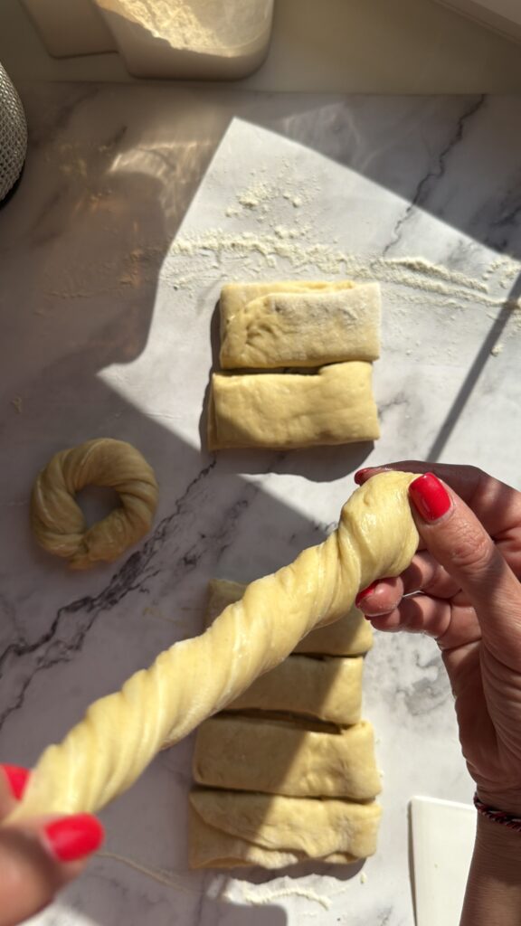 3. Obdélník nakrájejte na 8 dílu (přeložené těsto není potřeba nechávat odpočinout). Každý lehce v ruce natáhněte a stočte, zatočte do protisměru a následně do věnečku. Pokládejte na plech a v této fázi nechte znovu cca 30’ vykynout.