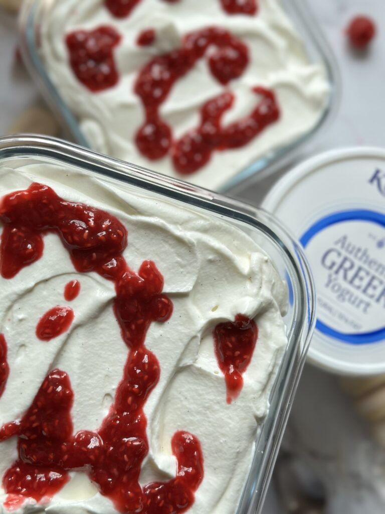 - Chuť: Jemná kyselost řeckého jogurtu vyváží sladkost krému a malin. Díky tomu není dezert přeslazený.