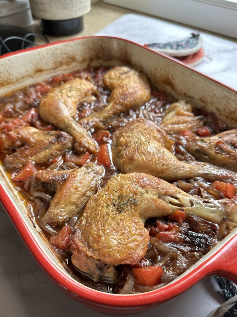 Pečené kuře na cibuli a rajčatech, když se mne zeptáte: „Máš ráda cibuli?“ …. moje odpověď zní za syrova vůbec, ale v okamžiku, kdy projde dlouhým pomalým procesem restovaní, vyprchá z ní veškerá pikantní štiplavost a nechá se lehce zkaramelizovat, tak ji miluji.