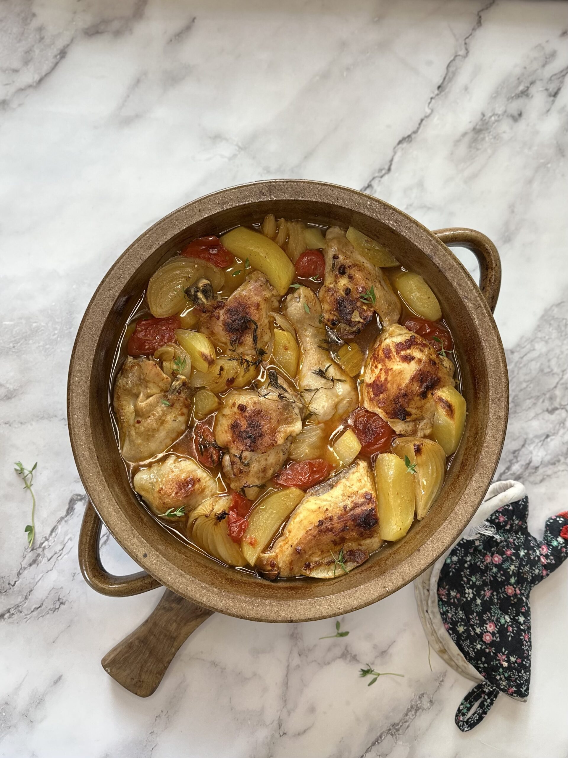 Vůně pečeného kuřete, cibule a rajčat s paprikovým kořením je tak silná, že se z trouby stává hlavní kuchyňský orchestr. Všechny suroviny se propojí, omáčka z rajčat a výpeku se vsákne do brambor a vznikne jídlo, které je jednoduché, ale nezapomenutelné.