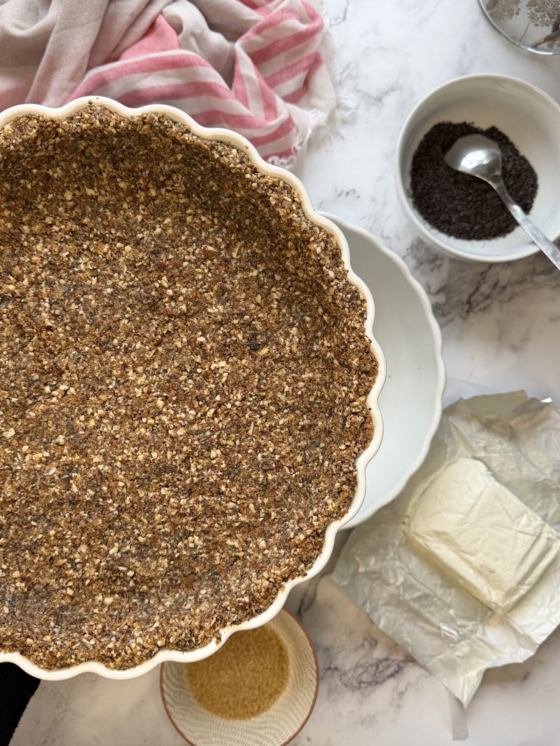 1. Korpus připravte tak, že sušenky a mandle, robotem rozmixované na drobečky, dejte do mísy, přidejte rozpuštěné máslo, mák, cukr, vodu a zpracujte, aby se vše spojilo. Vzniklou hmotou vyložte formu o průměru cca 23 cm. Stejnoměrně silnou vrstvou pokryjte dno i okraje. Vložte do předehřáté trouby na 170° a pečte 15′. Po upečení dejte vychladnout.