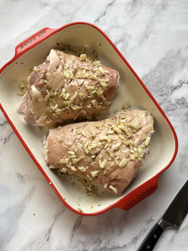 1. Kolena očistěte, dejte do velké mísy zalijte vodou, přidejte sůl, česnek a nechte ve slaném láku minimálně dvě hodiny naležet, ideálně přes noc.