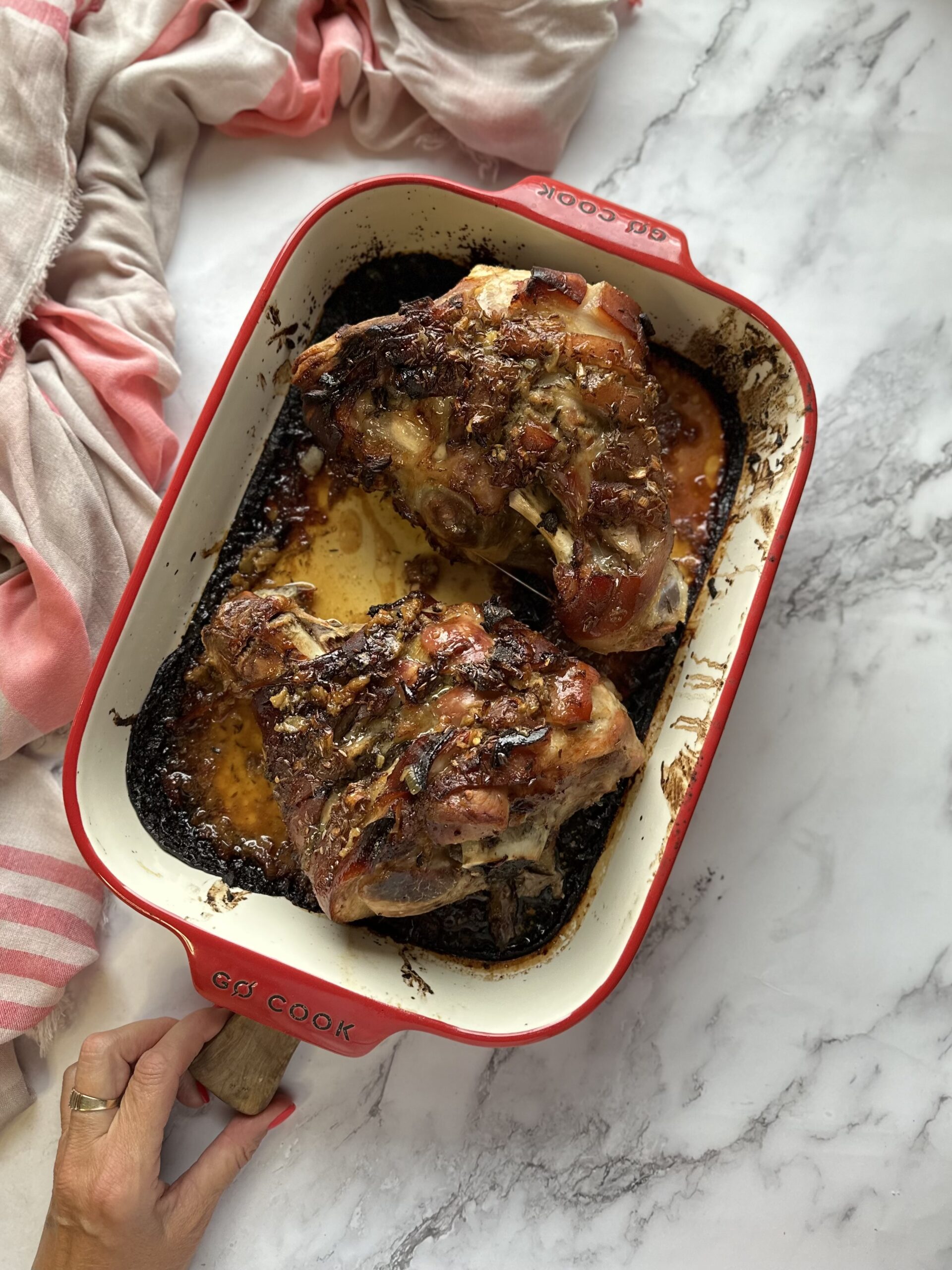 3. Koleno vytáhněte z láku a celé do kola potřete marinádou. Vložte do zapékací mísy, přikryjte a dejte do předehřáté trouby na 120-130 stupňů péct na čtyři hodiny. Po čtyřech hodinách maso, odkryjte zvyšte teplotu na 180 stupňů a nechte zapéct do zlata podle potřeby cca 15-20´.