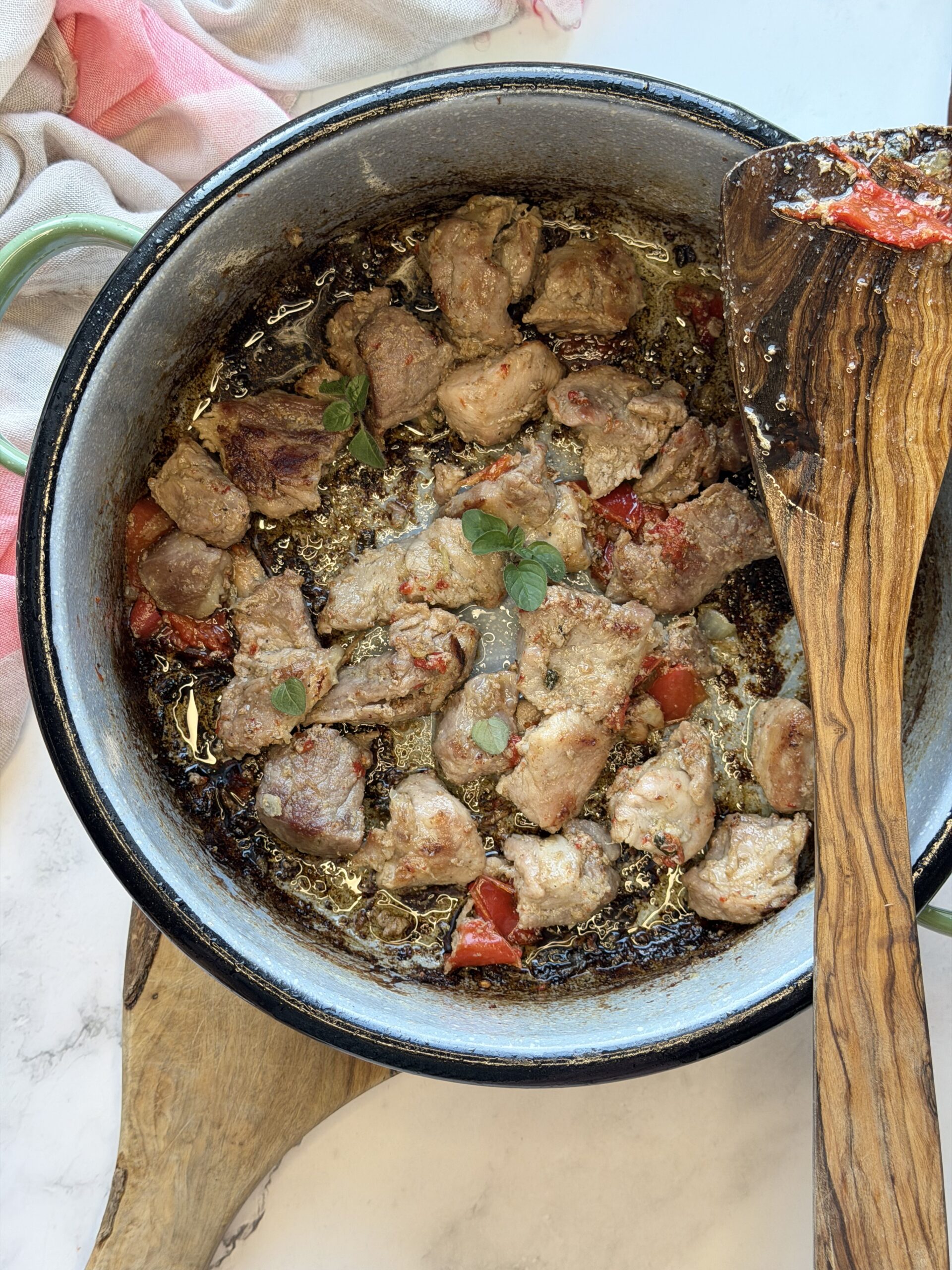 1. Na pánev dejte vepřové kousky o velikosti cca 3 x 3 cm, přidejte cibuli a kapií, okořeníme solí a pepřem, přilejte olivový olej a zalijte vodou tak, aby maso bylo z 90% ponořené.