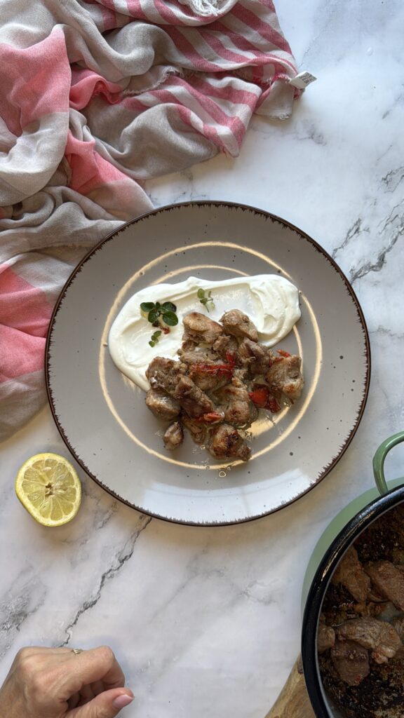 Smažené vepřové kousky bych nazvala zábavou u plotny, jedna otočka na podpatku a večeře nebo oběd je na světě. Jídlo, které je v Řecku dost oblíbené, velmi často se nazývá citronové vepřové a většinou se podává v tavernách, které se specializují na masové minutky.
