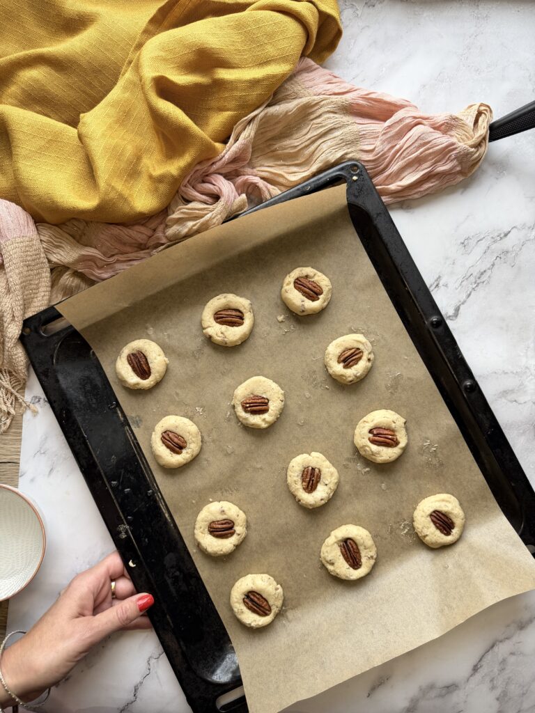 4. Po 10΄vytáhněte z lednice, udělejte kuličky cca 30 g, dlaní mírně stlačte a do středu dejte pekanový ořech. Pokládejte na plech s rozprostřeným pečícím papírem.