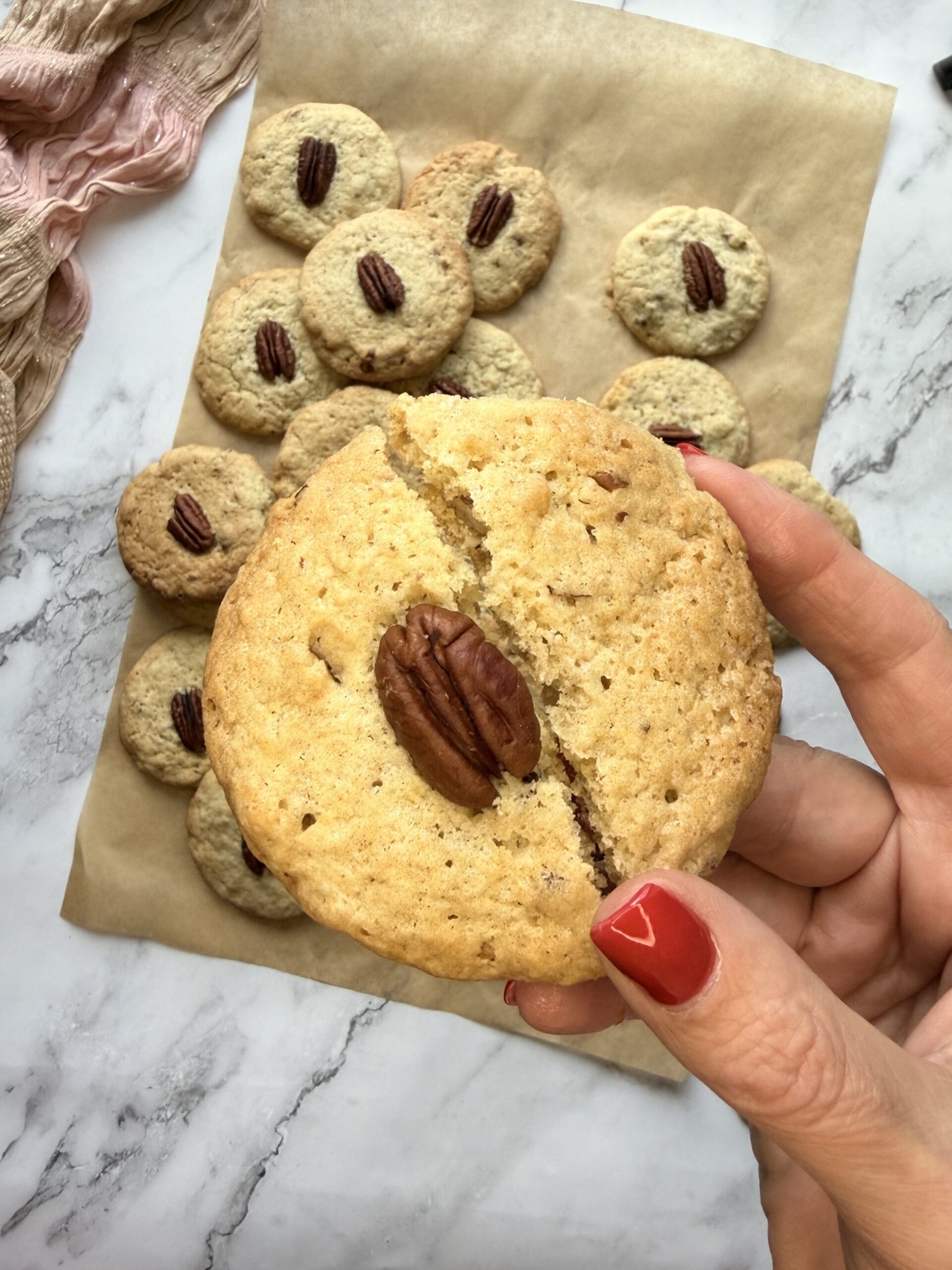 Pekanové ořechy hrají v těchto sušenkách zásadní roli, mají máslovou chuť a příjemnou vůni. Vzhledem připomínají trochu vlašské ořechy, ale jsou sladší a mají až karamelovou chuť.