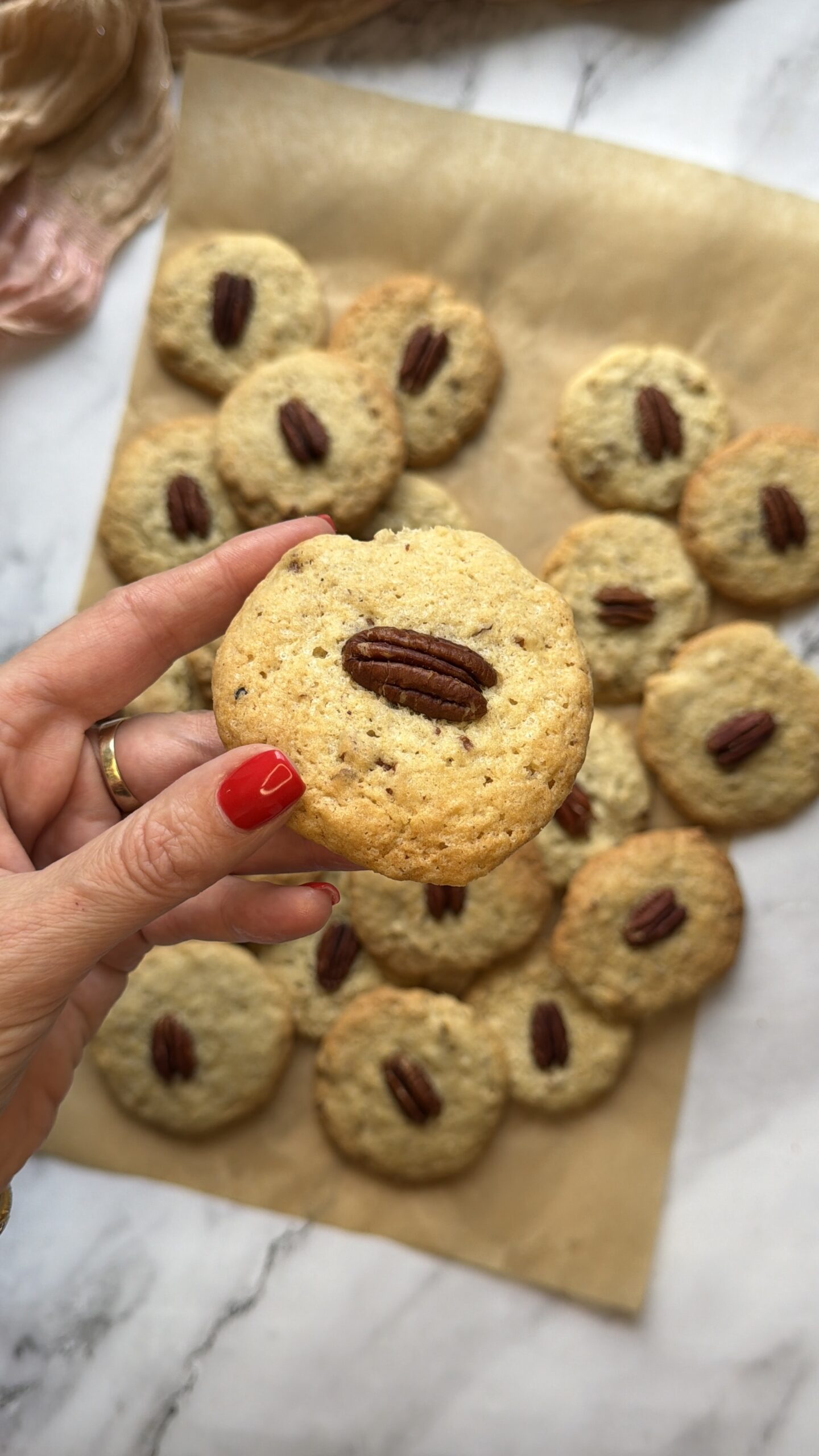 Pekanové ořechy hrají v těchto sušenkách zásadní roli, mají máslovou chuť a příjemnou vůni. Vzhledem připomínají trochu vlašské ořechy, ale jsou sladší a mají až karamelovou chuť.
