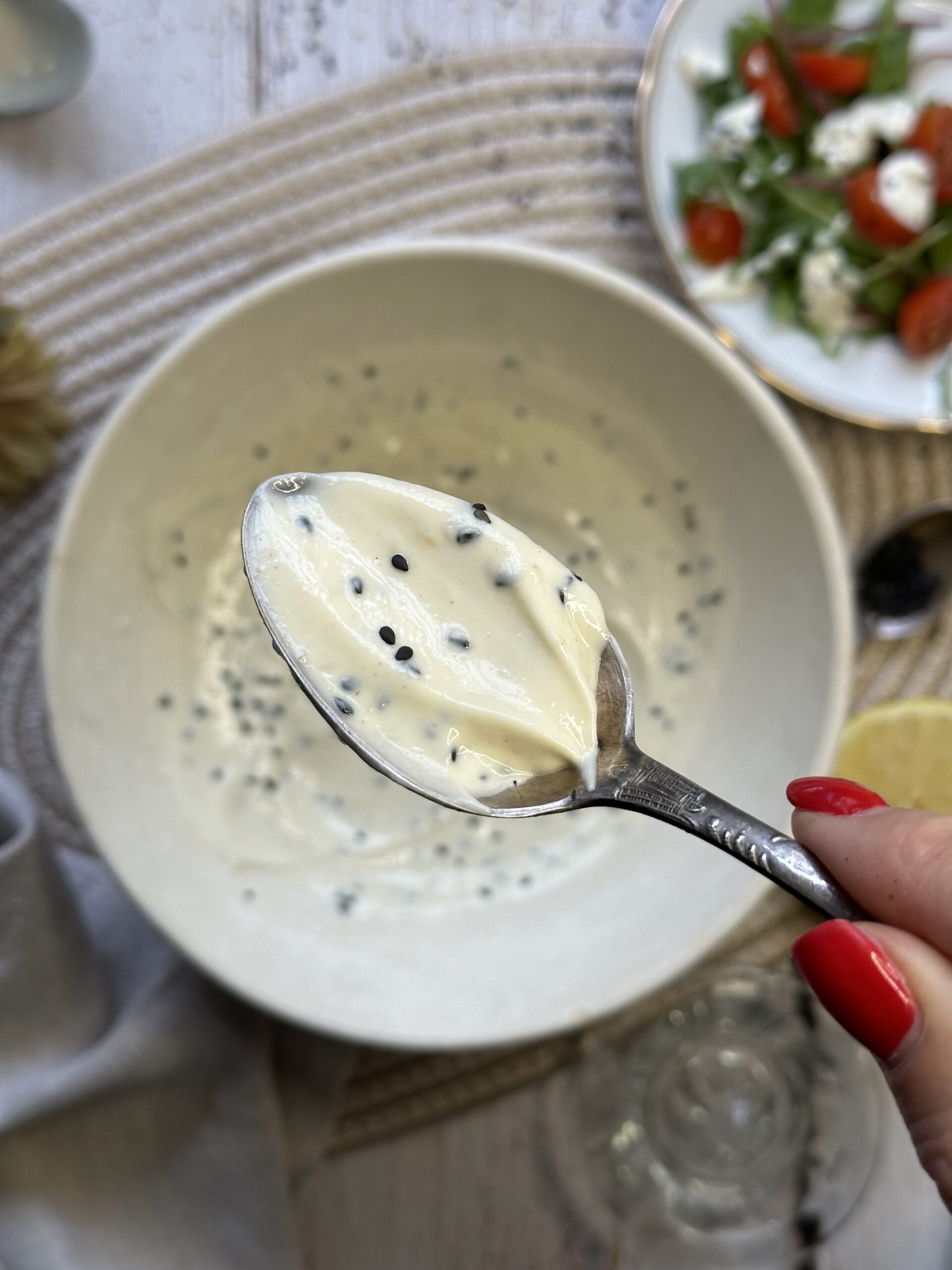 Tahini se úžasně hodí k jogurtu a spolu vytváří dokonalou rovnováhu. Salát doprovází mnoho jídel, obzvláště, si rozumí s těstovinami a rýží, s grilovaným masem, sýry a jogurtová zálivka s tahini určitě nic nepokazí.
