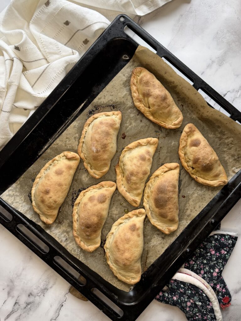 3. Těsto vyjmeme z lednice, rozdělte na 8 dílů, vytvarujte do kuličky a rozválejte na placku o průměru cca 15 cm. Doprostřed placky dejte náplň, uzavřete do půlměsíce, okraje stlačte vidličkou nebo zapleťte. Taštičky potřete olivovým olejem nebo smetanou a dejte péct do předehřáté trouby na 180°C. Doba pečení je cca 30-35’.