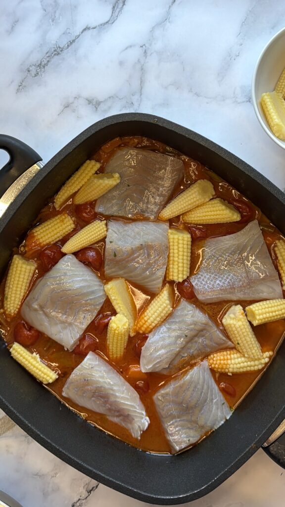 3. Jakmile je omáčka téměř hotová, přidejte rybu a kukuřici a pokračujte v dušení cca 10–15‘. Doba vaření záleží na tloušťce, velikosti a druhu ryby, všeobecně na úpravu ryb postačí několik minut. Jakmile ji vaříme nebo grilujeme příliš dlouze, ztrácí veškerou šťávu.