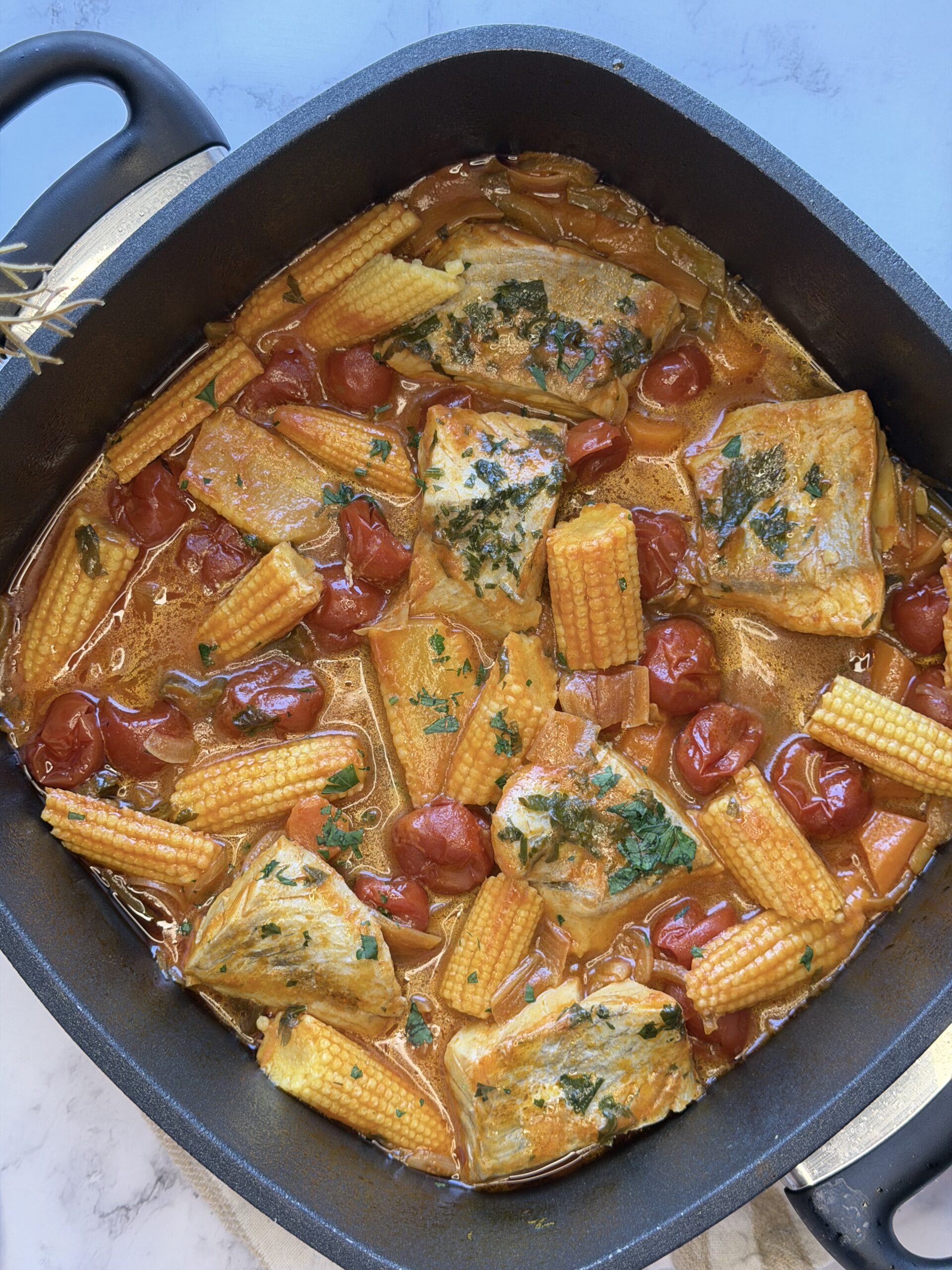 3. Jakmile je omáčka téměř hotová, přidejte rybu a kukuřici a pokračujte v dušení cca 10–15‘. Doba vaření záleží na tloušťce, velikosti a druhu ryby, všeobecně na úpravu ryb postačí několik minut. Jakmile ji vaříme nebo grilujeme příliš dlouze, ztrácí veškerou šťávu.