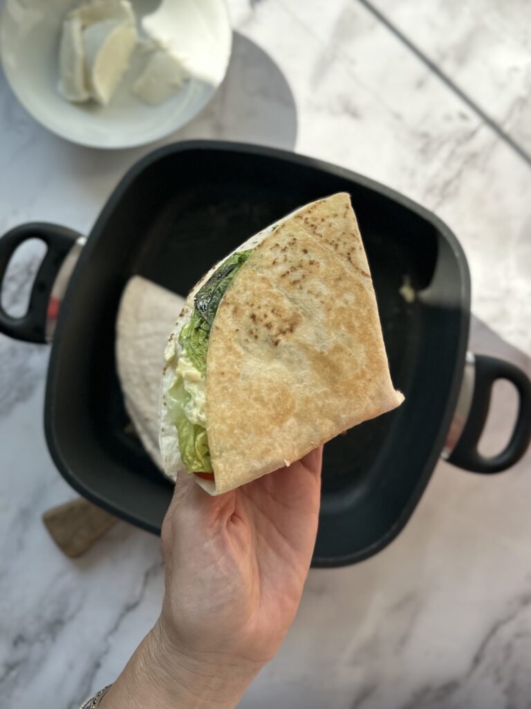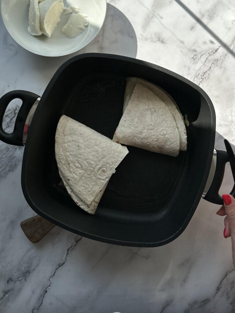 3. Na suché pánvi opečte tortillové vějířky z obou stran dozlatova, aby tortilla byla křupavá a sýr uvnitř rozteklý.